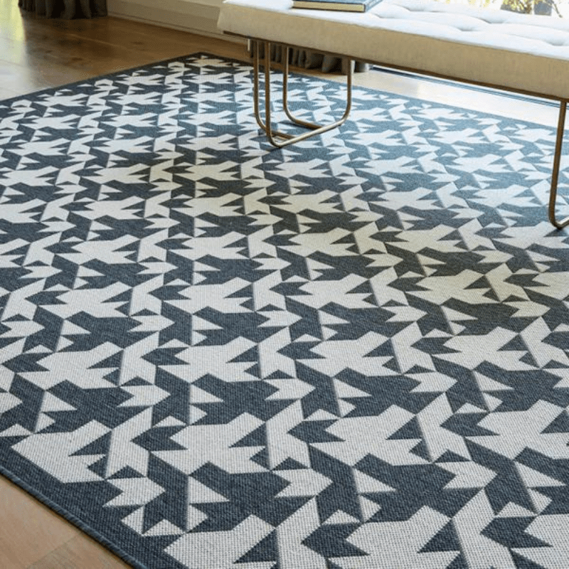 A daring Rug using interlocking solid triangles and squares creating an impression of migrating flocks.