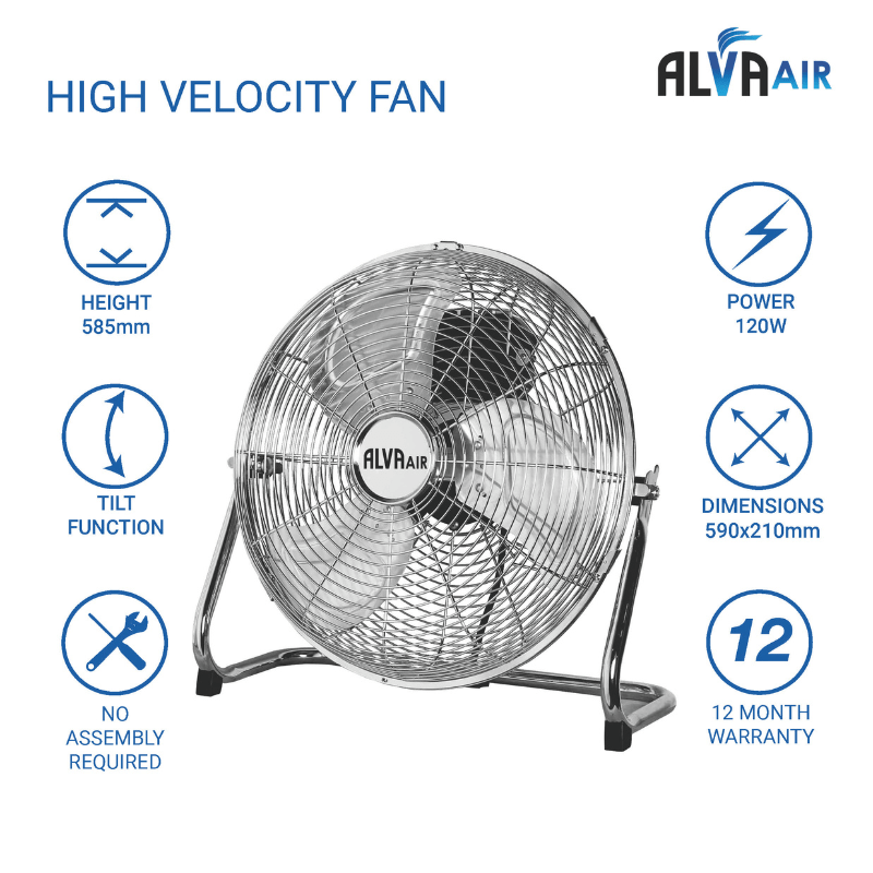 Stay cool with the 50cm High Velocity Floor Fan – Chrome, featuring a powerful 120W motor. Enjoy adjustable speed and tilt for maximum comfort. Perfect for homes and offices.