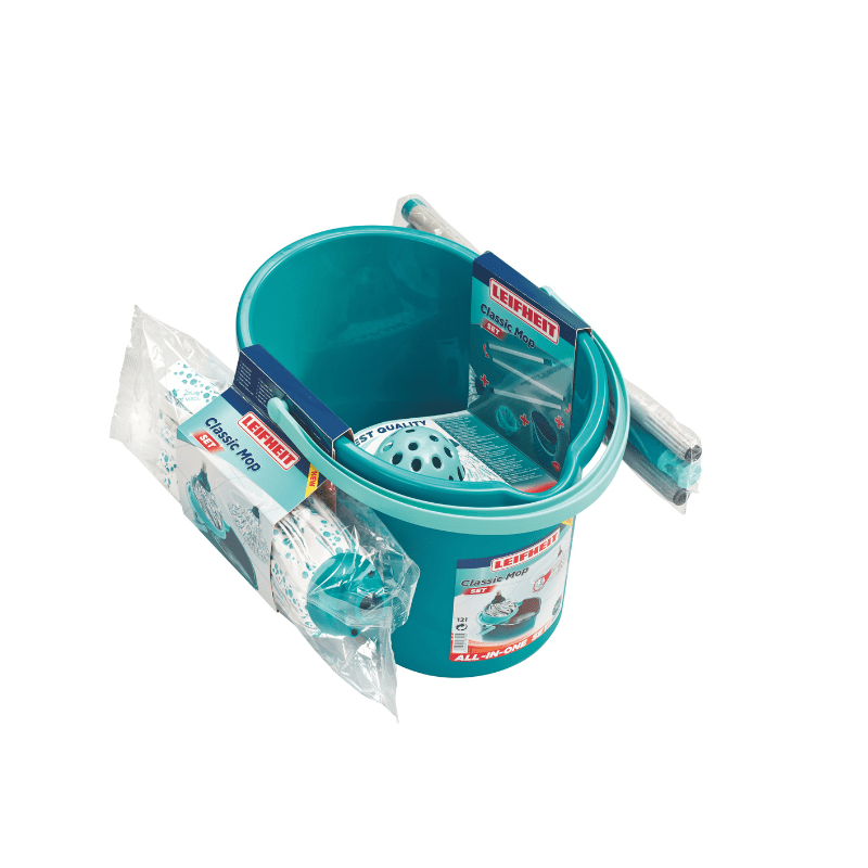 Introducing the Leifheit Classic Mop & Bucket Set, your ultimate solution for quick and effective floor cleaning. This practical all-in-one set includes a classic mop with absorbent viscose strips designed to remove dirt and water in a single wipe, leaving your floors sparkling clean.