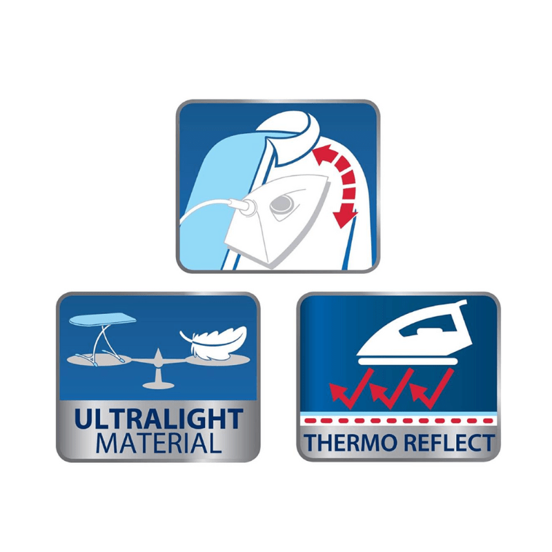 The board is also designed with an ironing surface made from special ultra-light plastic, making it easy to open and close. Measuring 120 x 38cm, the ironing surface rests on a 35mm thick, completely stable, tubular frame. The height of the board can be tailored to suit the user by ranging between 75cm to 98cm and is equipped with a fixed iron rest. This ironing board with Thermo Reflect technology has been specially designed for use with standard irons and steam irons.