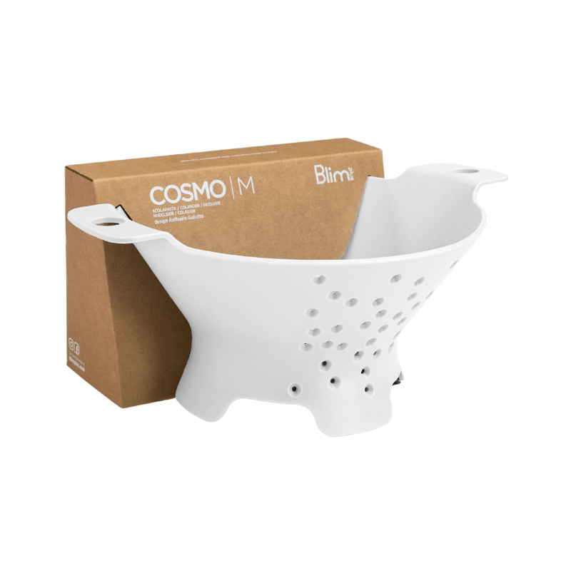 The Blim Plus Cosmo Colander in Arctic White offers practical draining and rinsing for everyday kitchen use. This 32x25x13 cm colander from Italian brand Blim Plus features a hole pattern narrower inside than outside, allowing even pasta draining over the full surface while holding spaghetti in place. Use it to rinse salad leaves, wash fruit, or drain boiled pasta.