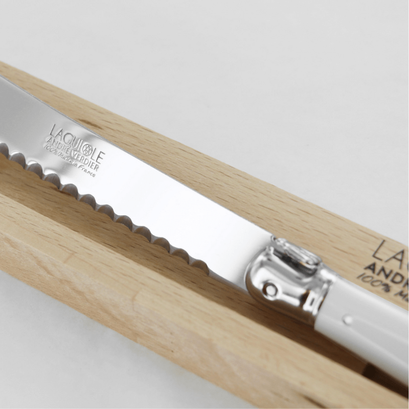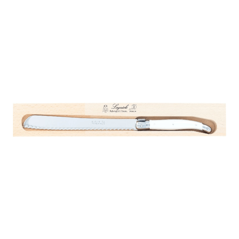 The Andre Verdier Bread Knife-Chalk White is a classic country look bread knife. Made in France. Comes with an etched wooden storage tray.