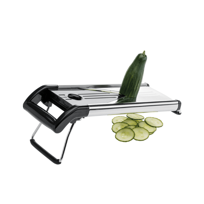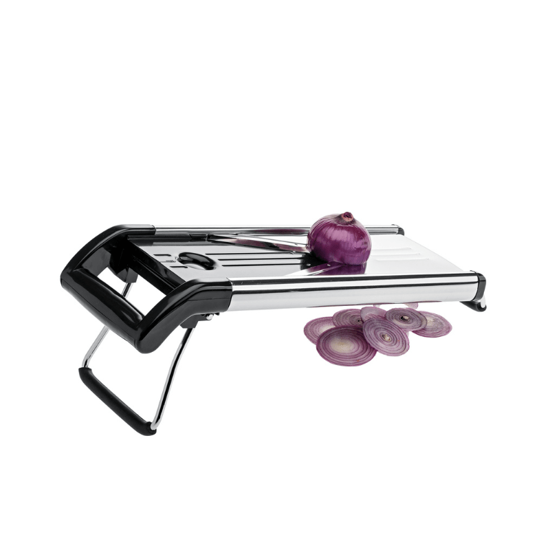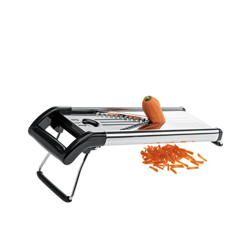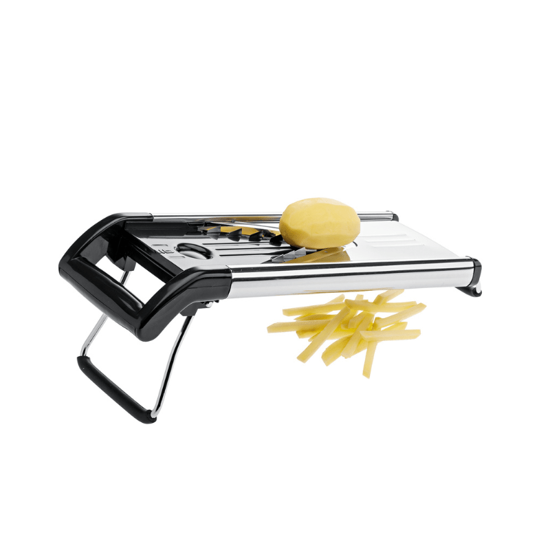 Vegetables and fruit can be turned into even slices or julienne in an instant. The V-blade ensures consistent results with little effort. The slicer comes with 5 cutting inserts from 1.5mm to 7.5 mm, and the non-slip feet allow for safe use. It can be used for slicing onions or cucumbers, cutting strips of carrots, and even making thin cut chips.