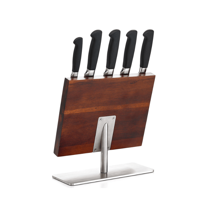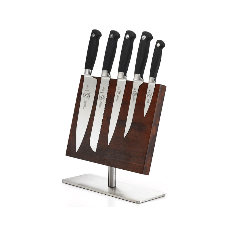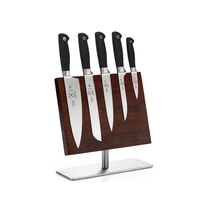 The Mercer Culinary Genesis 6 PC Set has Five knives — all securely displayed on a steel-mounted Acacia wood storage board.