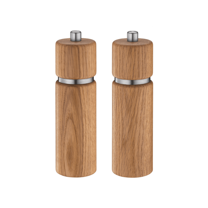 Crafted from robust oak wood, each mill features a sleek, slender design complemented by a stainless steel ring that enhances its visual appeal. The beautiful grain of the oak not only adds a touch of nature to your dining table but also ensures durability and longevity.