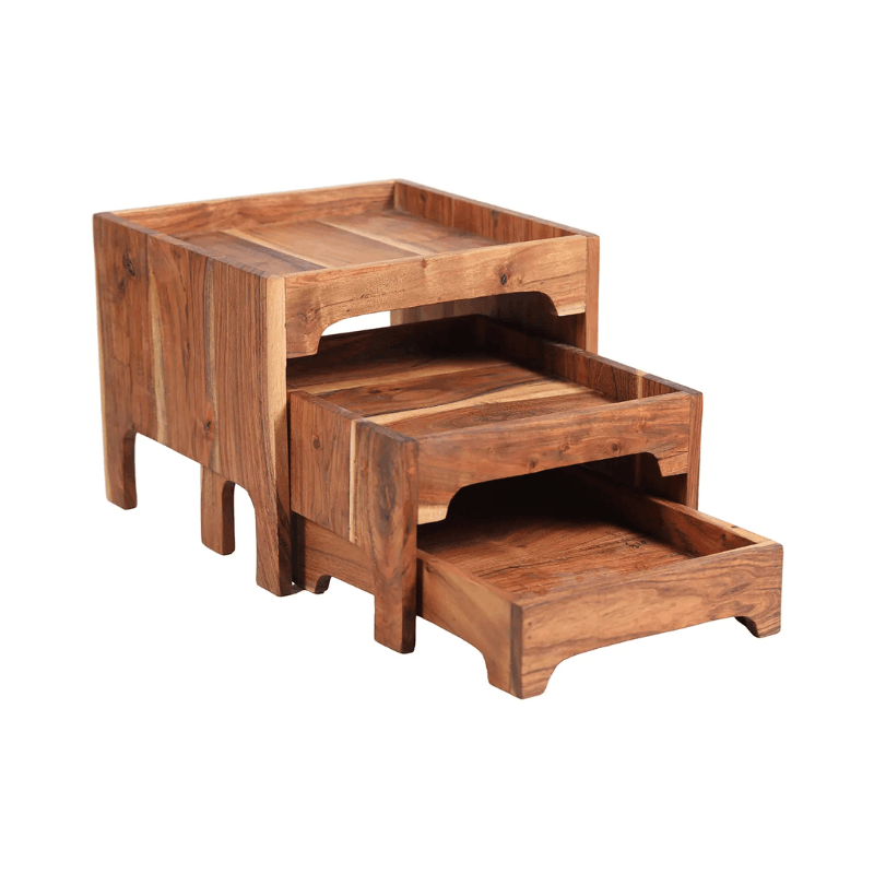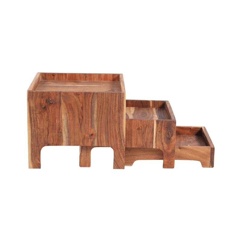 The acacia wood food display racks set of 3 includes three tiered sizes for dynamic setups: