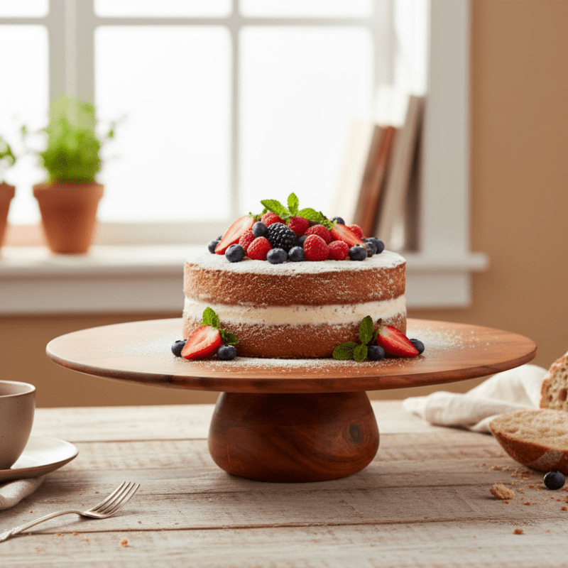 This Wooden Cake Stand 35x35x10cm elevates South African baking displays with its high-quality, round construction that showcases cakes, pastries, or tarts beautifully at tea times, parties, or family gatherings. Crafted from premium acacia wood and treated with food-safe oil, it ensures hygienic safety while highlighting natural rich tones and unique grain patterns for timeless elegance.