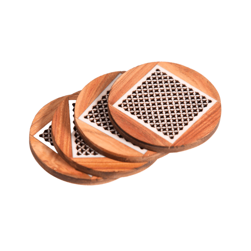 With their practical design, these coasters effectively prevent condensation and drips from damaging your furniture, making them an essential solution for everyday use. The white inlays not only serve as functional placeholders for your drinkware but also create a visually striking contrast against the wood, making these coasters a stylish addition to your home decor.